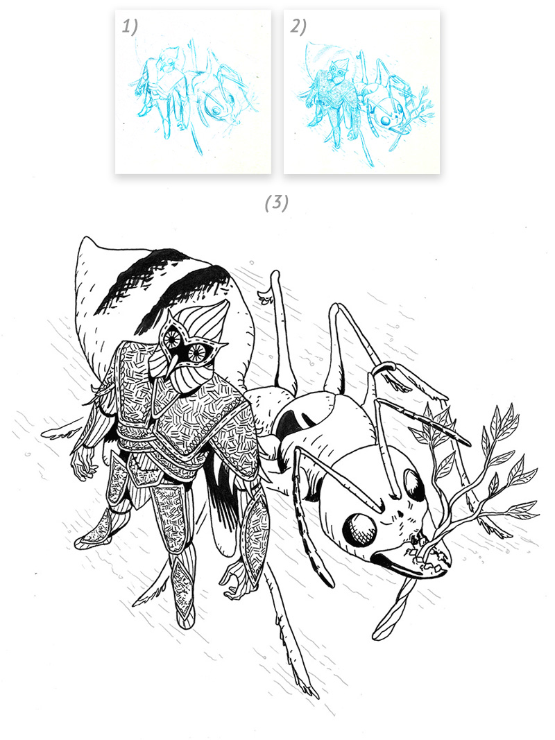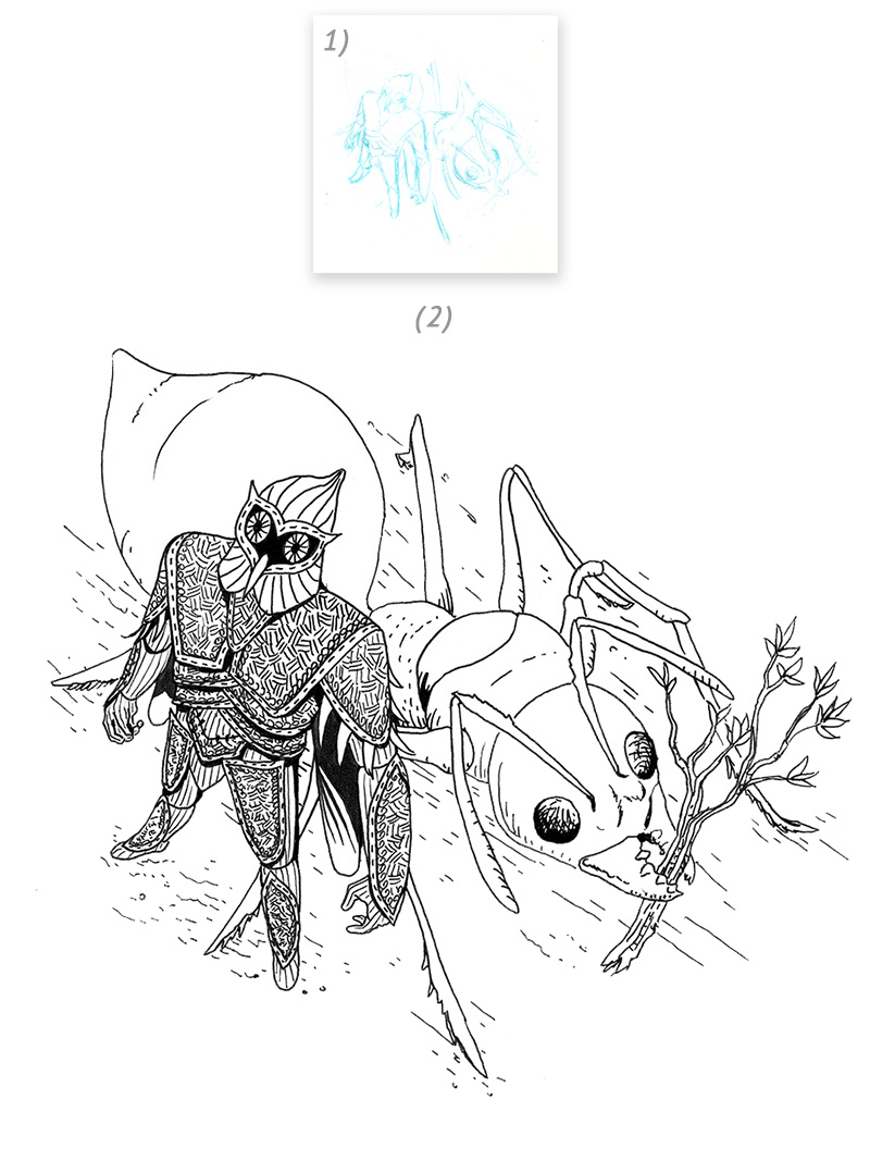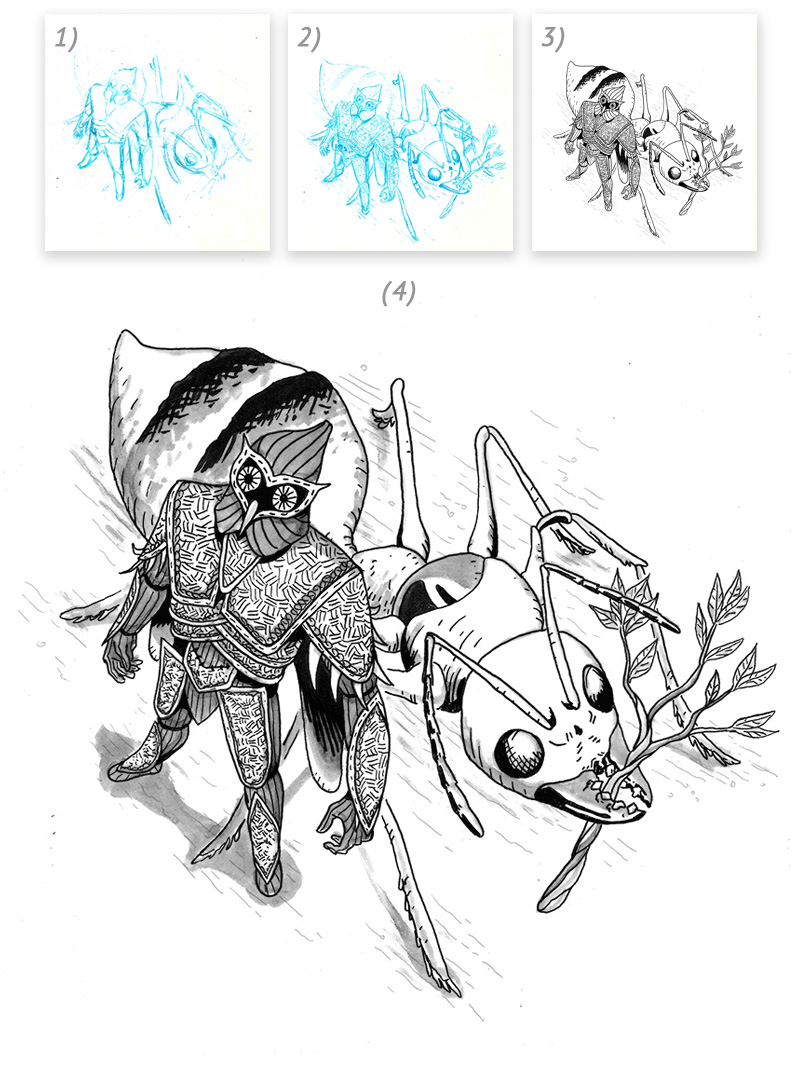 2 – Rascunho. > Desenho a lápis. > Arte final a nanquim.