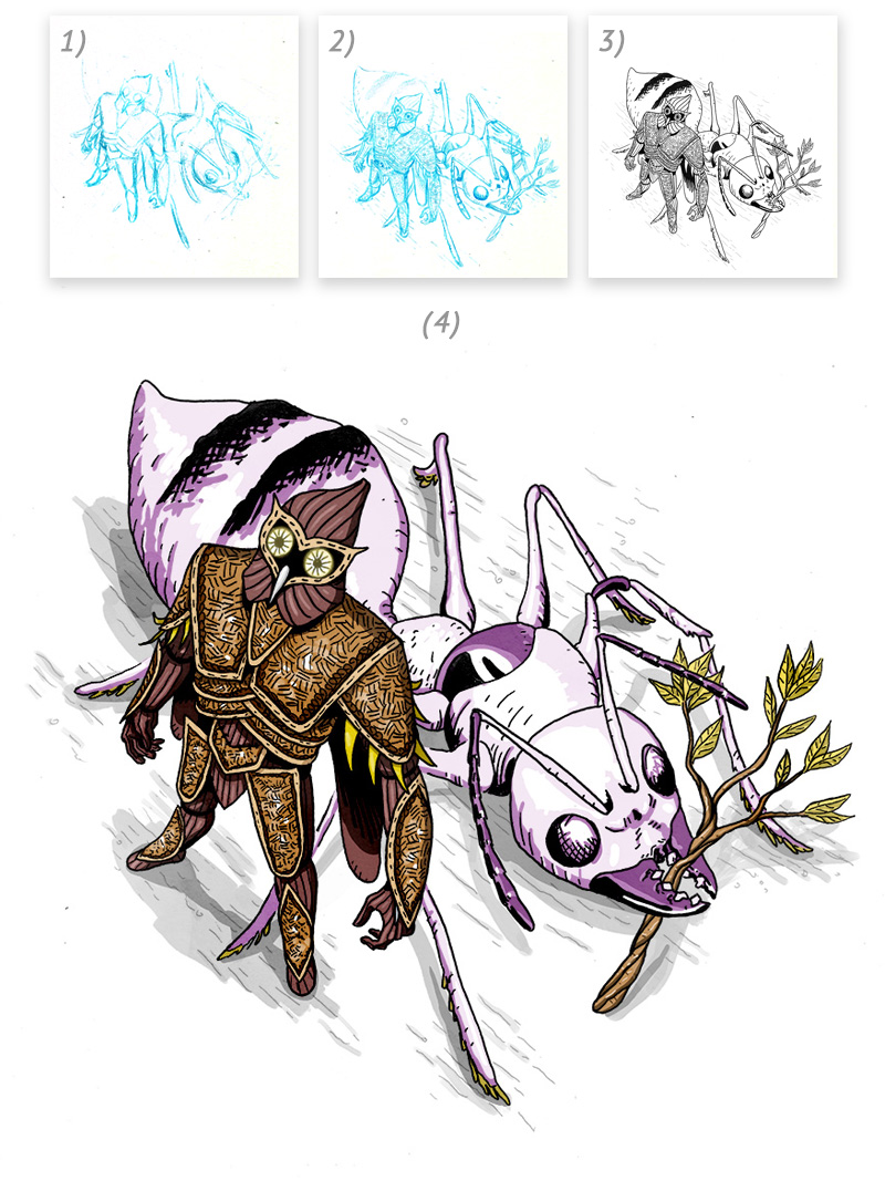 4 – Rascunho. > Desenho a lápis. > Arte final a nanquim. > Pintura digital.