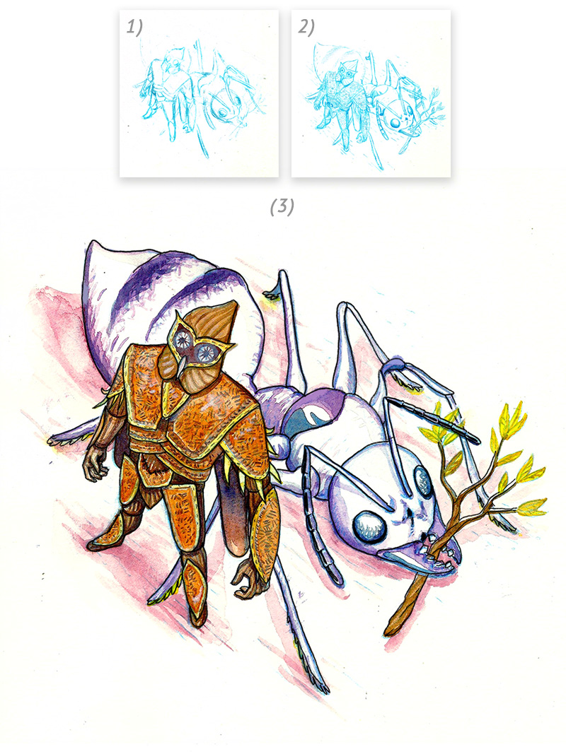 Para hoje, trago este estudo que realizei. Como não tenho um estilo de arte final definitivo, resolvi fazer um teste: Executar todas as arte finalizações que sou apto a realizar. Usei um único desenho de “molde”. No caso, o personagem Coruja, criado para o projeto de comics Mr.Páprica. A formiga gigante foi um capricho meu. Apesar de não fazer muito, gosto de desenhar inseto.Esse teste me traz tanto um mostruário de possibilidades artísticas, assim como foi um excelente estudo de tempo de execução. Como todas as arte finais produzidas foram baseadas no mesmo desenho, agora sei exatamente a diferença de tempo de execução entre elas. Consigo pintar um desenho mais rápido no computador ou com aquarela? Qual consigo ter um melhor resultado em menos tempo? Agora eu sei. Ou melhor, tenho uma maior certeza.