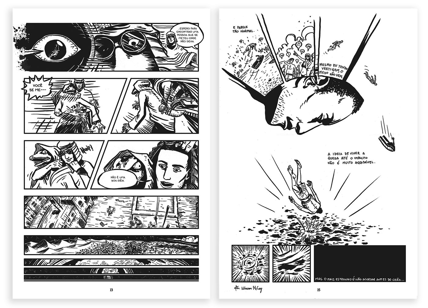 Comic book published in the Catacomics magazine volume 3. It’s about a boy who goes to sleep and wakeup in another reality, where he has the ability to, whenever necessary, see 2 seconds in his future. The comic belongs to a larger project involving several connected protagonists who are able to transit between our planet Earth and an alternative. The project is called Mr. Paprica. Script developed by Guaraci Cabreira.
