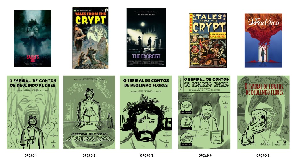 Poster for a movie produced in Florianópolis, Brazil. The film has a character, Deolindo, who presents three tales of terror. Mr. Flores is in the center of the poster, while the smoke spiral in the background contains images from the tales of terror.