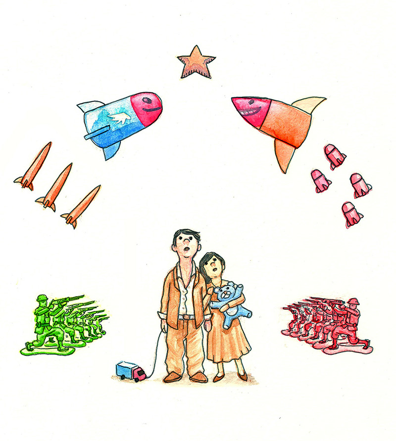 Ele aborda as crianças em zonas de conflito, que tem que seguirem adiante, segurando seus temores. A imagem aborda mais especificamente o trecho em que o escritor fala sobre como pessoas que partilham de uma visão coletiva podem gerar uma bolha de realidade para tornar sua vivencia aceitável. No caso da ilustração, as crianças veem a guerra em que vivem com mais suavidade.