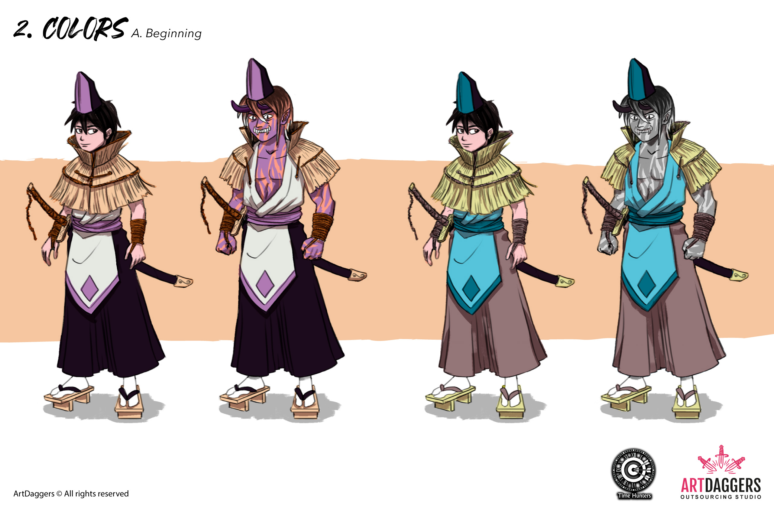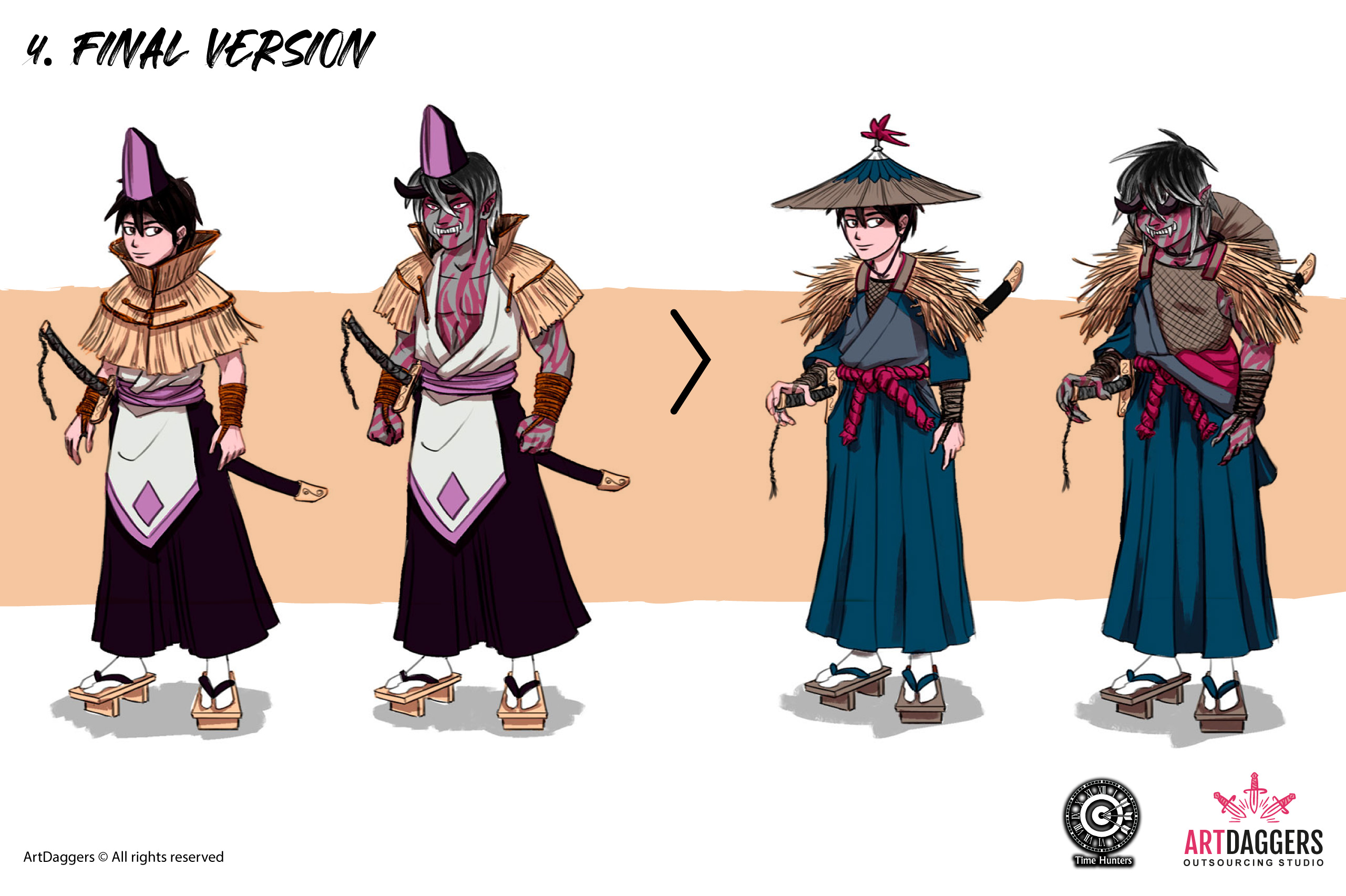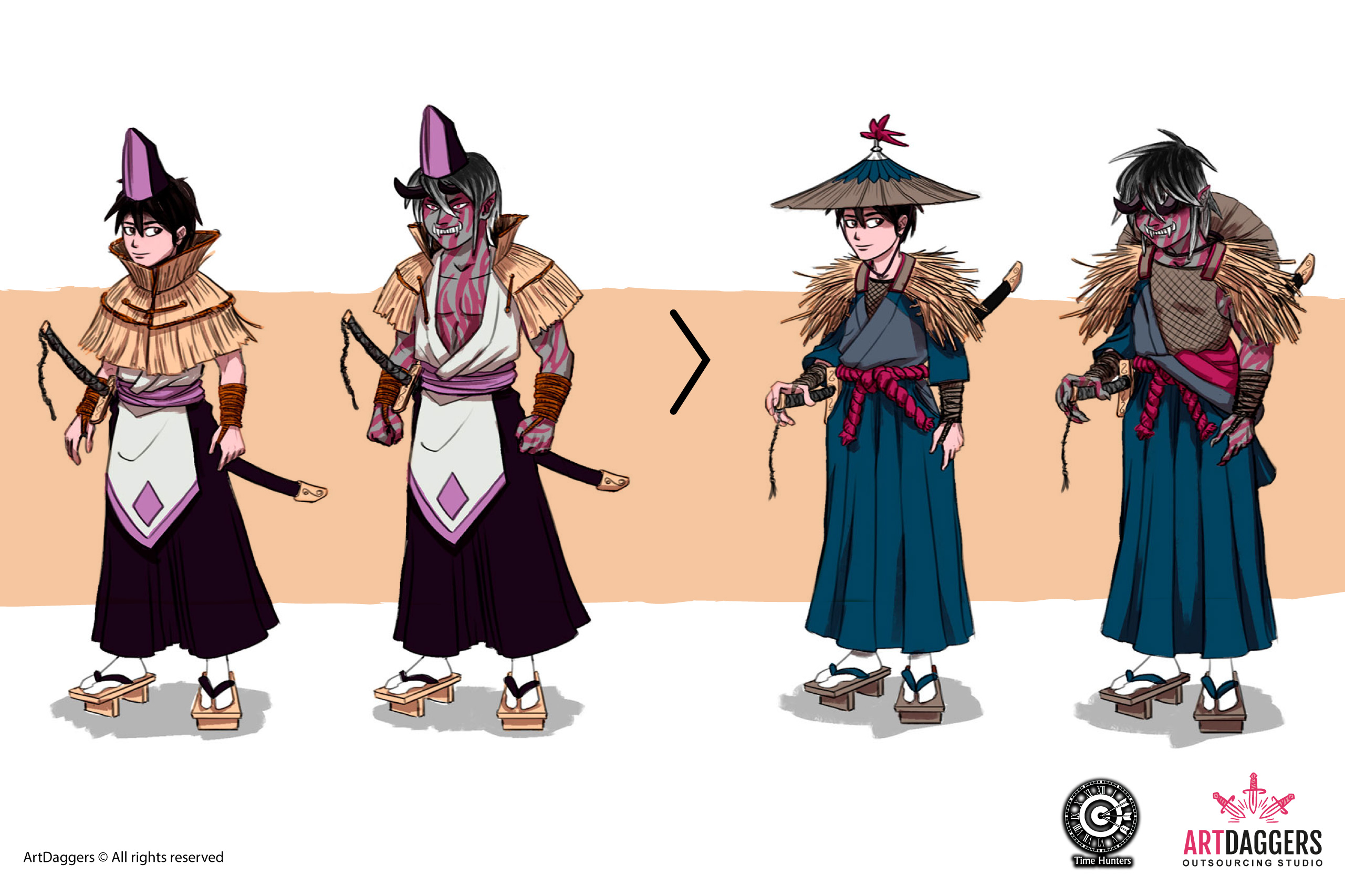 Shintaro’s creation process was interesting, as the clothing options development became part of the plot: to better enjoy the beautiful concepts developed, we chose to have one outfit for the beginning of the character’s journey and another for the end.