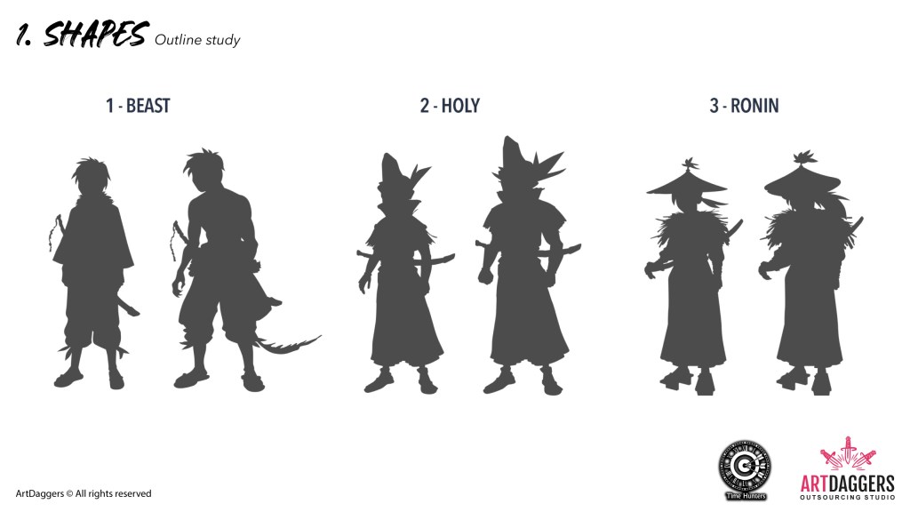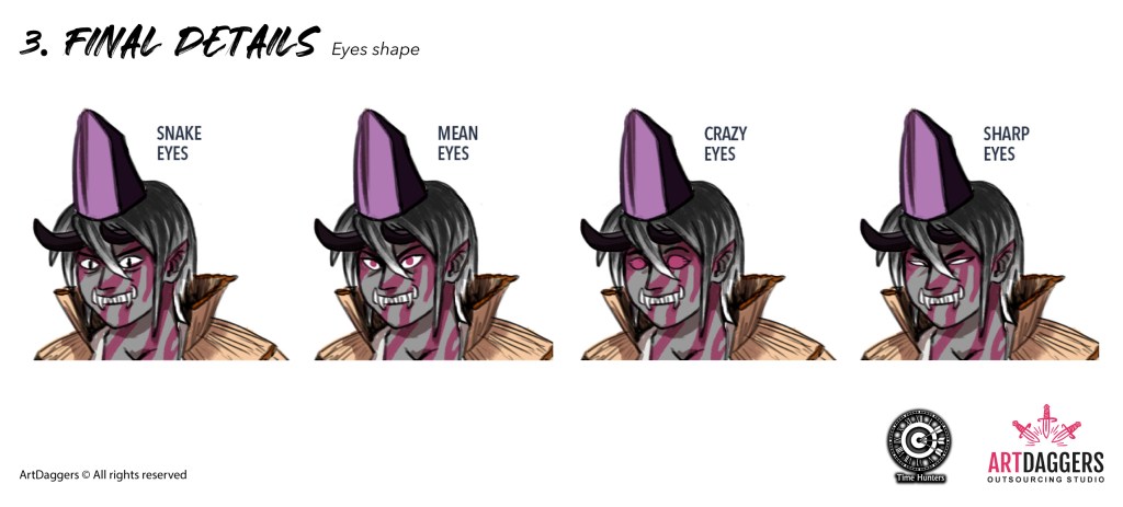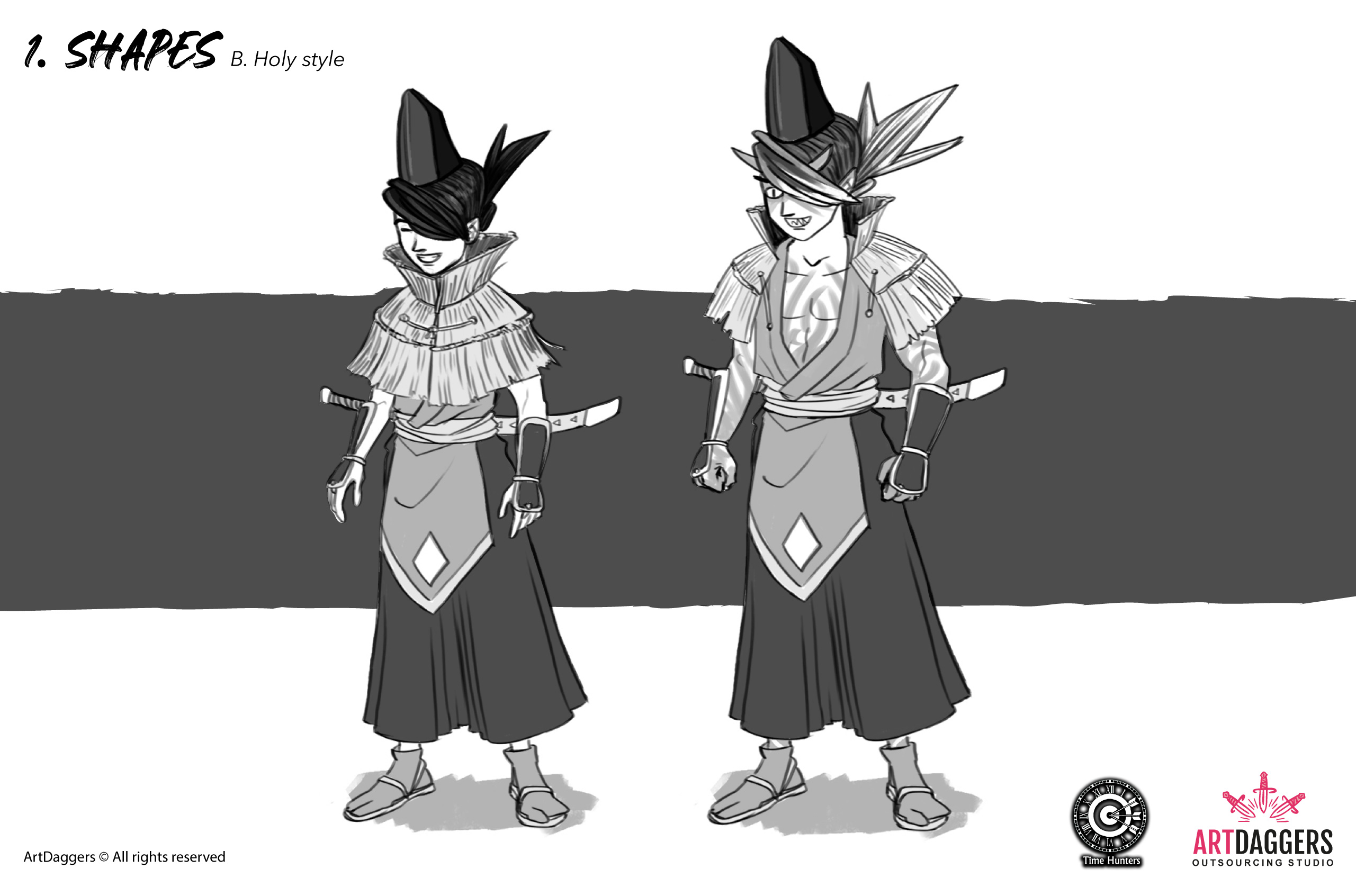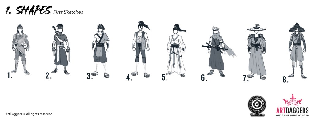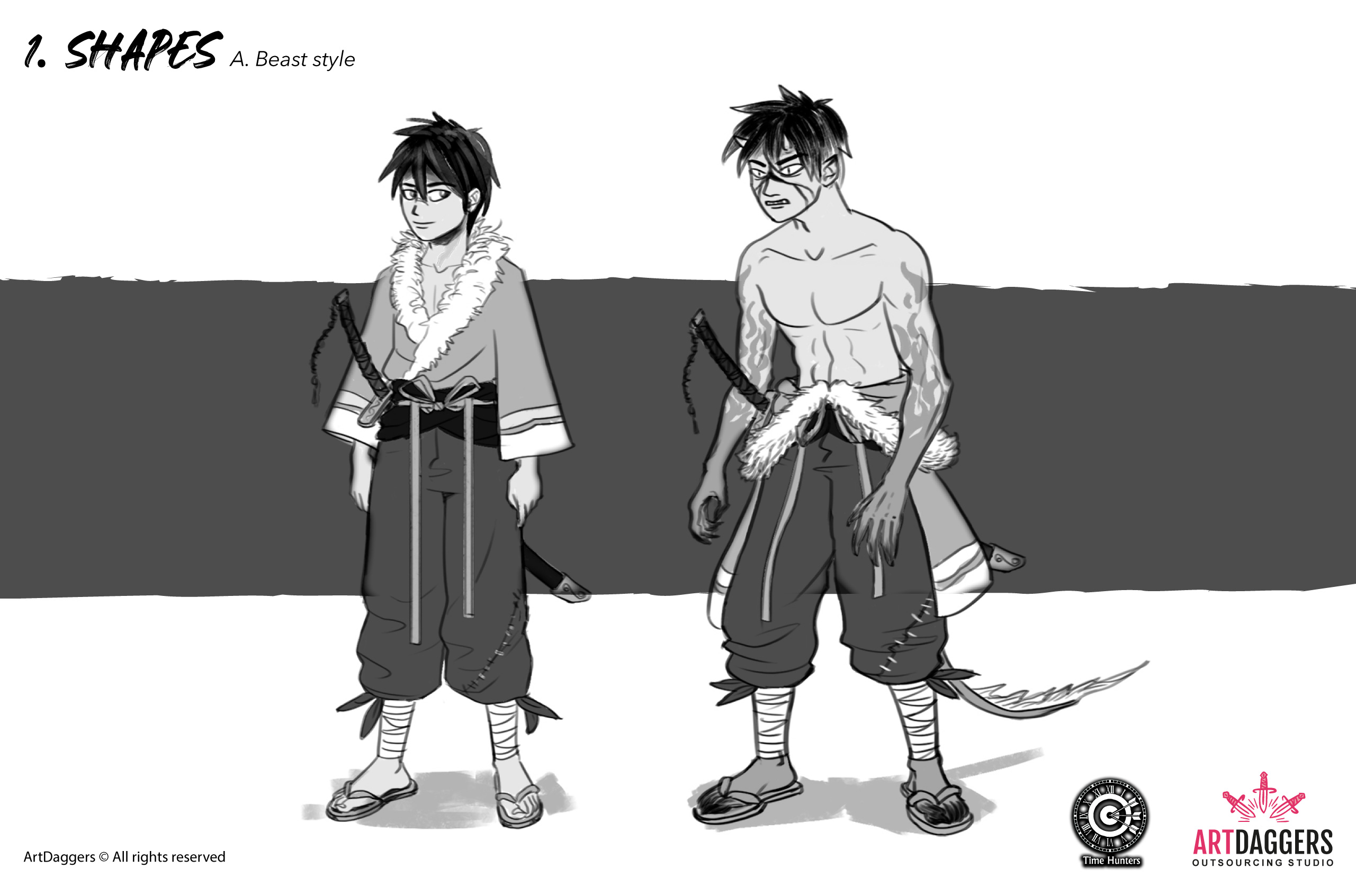 Shintaro’s creation process was interesting, as the clothing options development became part of the plot: to better enjoy the beautiful concepts developed, we chose to have one outfit for the beginning of the character’s journey and another for the end.